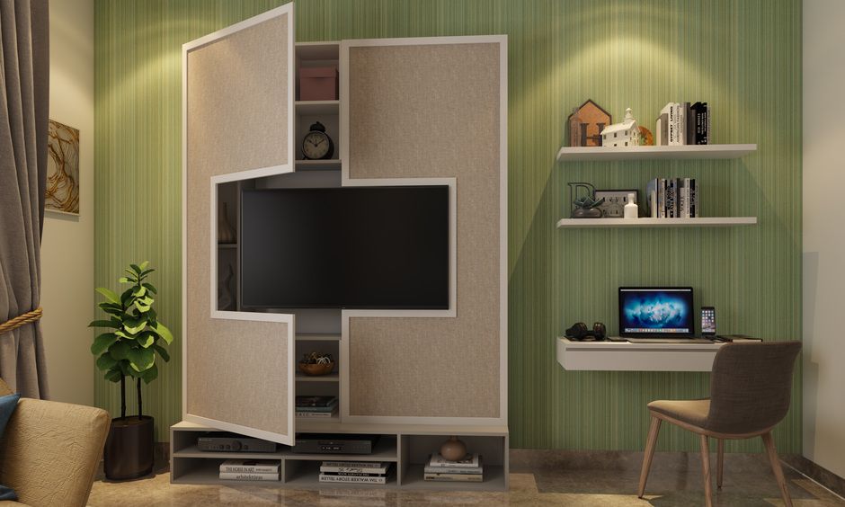 This creative almirah for the living room is the perfect choice for those looking for a multifunctional element in their home. It is a good alternative to traditional television showcases as the doors smartly hide the storage space built within it for other essentials.