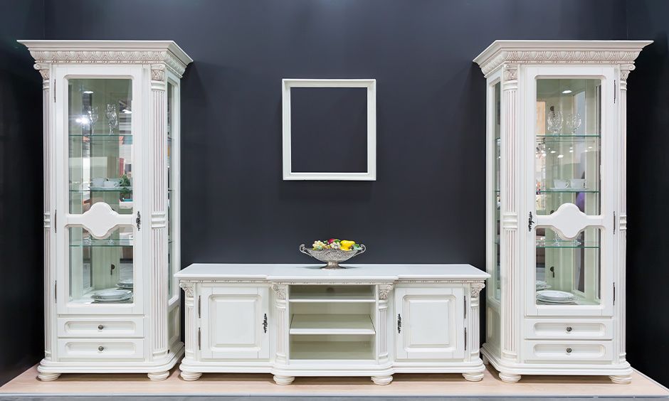 This antique-style glass almirah design for the living room makes a bold and beautiful statement against the dark grey accent wall and light grey flooring. The glass on all three sides reflects light and makes the space look brighter and airier yet dust-free.