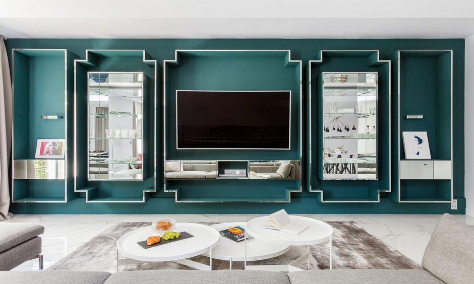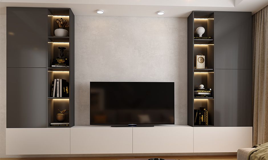 If you have a wide recess in your accent wall and don’t know how to amp it up then you can opt for this pair of wall almirahs. They seamlessly envelop the television set between them, tie all the elements together perfectly and provide ample storage capacity.