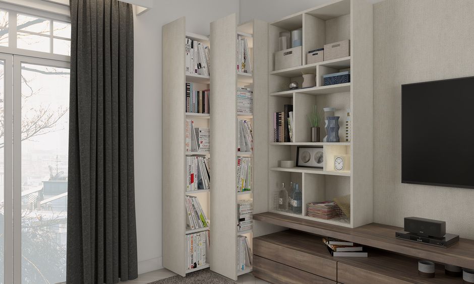 This hidden almirah is a smart space-saver for modern homes as you can slide out the bookshelves whenever you are in the mood to read or slide it right back in when you need the space for social events. It gives a unique and overall cohesive feel to the social space.